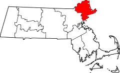 Condado de Essex | 009 | Salem y Lawrence | 1643 | Uno de los cuatro condados originales creados en la colonia de la bahía de Massachusetts. Gobierno abolido en 1999.[2] | Por el condado inglés de Essex | 723 419 | km² ( 498 mi²) | 1290![]() |