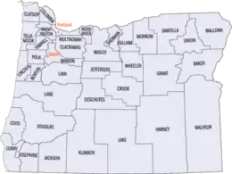 Condado de Washington | 067 | Hillsboro | 1843 | Uno de los cuatro distritos originales del territorio de Oregón (como el distrito de Twality). | George Washington (1732 – 1799), fundador de los Estados Unidos y primer Presidente de los Estados Unidos. | 445 342 | km² ( 724 mi²) | 1875![]() |