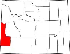 Condado de Lincoln | 023 | Kemmerer | 1911 | Parte del condado de Uinta. | Abraham Lincoln (1809-1865), presidente de los Estados Unidos (1861-1865). | 14 573 | km² ( 4069 mi²) | 10 539![]() |