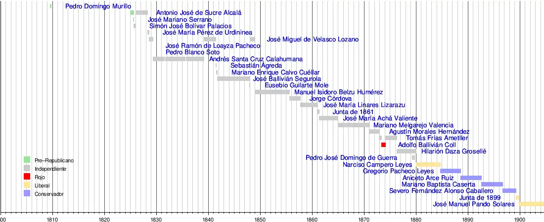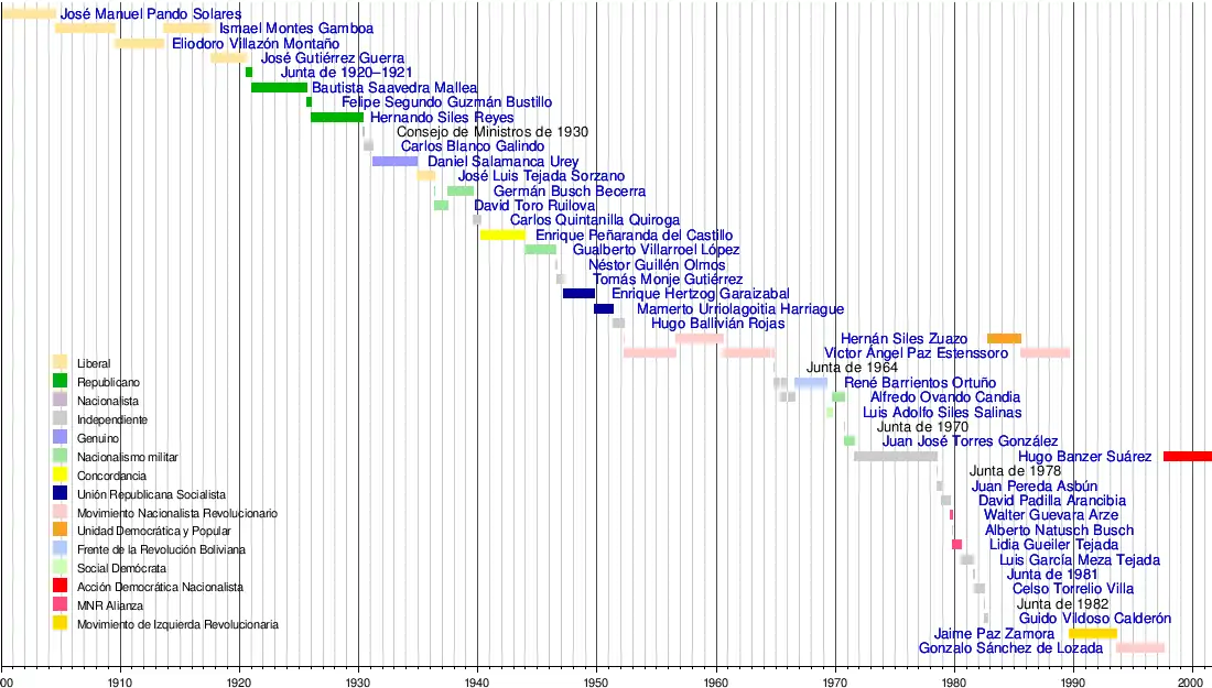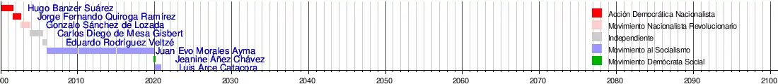 La siguiente línea temporal representa la progresión de los presidentes de Bolivia y su afiliación política al momento de asumir el mando constitucional: