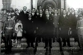 Fotografía tomada en Sevilla el 9 de mayo con motivo de la inauguración de la Exposición Iberoamericana de 1929-1930. Aparecen en la imagen el presidente del Consejo de Ministros Miguel Primo de Rivera (hacia el centro), Román Silveira (primero por la izquierda), su esposa Luisa y sus hijos Guillermo y Luis, el ministro de Economía Nacional Francisco Moreno Zuleta, el alcalde de la capital Nicolás Díaz Molero, el comisario de la muestra José Cruz-Conde Fustegueras, etc.
