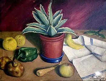 Sin título (bodegón), "Silveira / Garcia y Galan [sic] / otoño 1947". Óleo sobre lienzo, 34 x 44 cm. Los toques de pintura blanca que se observan en el ángulo inferior derecho de la obra corresponden a un intento de borrado por parte del propio autor al objeto de reutilizar el lienzo que finalmente no llegó a consumarse. Col. particular, Badajoz.
