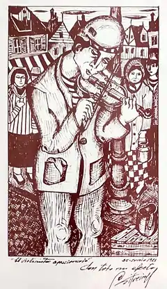 El violinista apasionado, firmada y fechada el "25-JUNIO 1983". Sanguina sobre papel, 30 x 25 cm. Col. particular, Badajoz.