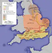 GB | En 871 llega desde Escandinavia el «Gran Ejército de verano»,[36] liderado por Bagsecg. En 874, los hombres del Gran Ejército pagano, así fortalecidos, pudieron conquistar a Mercia, persiguiendo al rey Burgred. El mismo año, un gran número de ellos se establecieron en territorios conquistados, seguidos en 877 por otro grupo. | ||