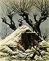 Cabaña cubierta de nieve (Cabaña en la nieve) - Verschneite Hütte (Hütte im Schnee) | h. 1827 | 31 cm × 25 cm, óleo sobre lienzo | Berlín, Nationalgalerie |