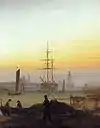 Veleros en el puerto al atardecer (Schiffe im Hafen am Abend) | 1827-1828 | 31 cm × 25 cm, óleo sobre lienzo | Dresde, Gemäldegalerie |