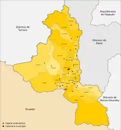 ![]() | ![]() | Diócesis de Mocoa-Sibundoy | Luis Albeiro Maldonado Monsalve | San Pablo Apóstol (Sibundoy) San Miguel Arcángel (Mocoa) |