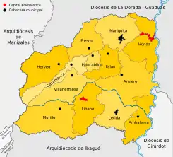 ![]() | ![]() | Diócesis de Líbano-Honda | José Luis Henao Cadavid | Catedral Nuestra Señora del Carmen, Líbano (Tolima) y Catedral Nuestra Señora del Rosario, Honda (Tolima) |