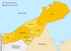 ![]() | ![]() | Diócesis de Riohacha | Vicariato: 4 de diciembre de 1952 (Pio XII) Diócesis: 16 de julio de 1988 (Juan Pablo II) | Francisco Antonio Ceballos Escobar C.Ss.R. | Catedral de Riohacha (Riohacha) |