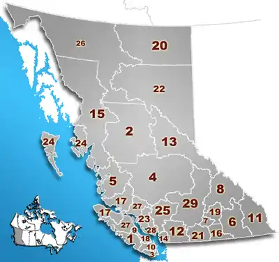 * La región de Stikine no está oficialmente clasificada como una región,[1] y está administrada directamente por el gobierno provincial.
