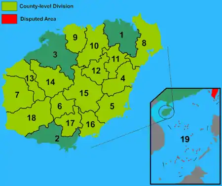 Hainan also has sixteen county-level divisions directly under the province with no intermediate prefecture level.