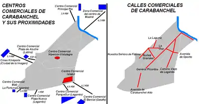 Carabanchel cuenta con dos centros comerciales en su territorio, aunque además de estos dos centro comerciales, Carabanchel cuenta con 8 centros comerciales que se encuentran muy cerca como máximo a 5 o 6 km como son "Plaza de Aluche" (a 650 metros), en Leganés encontramos el centro "M-40" (a 2,6 km), "Plaza Nueva" (3 km), "ParqueSur" (4,9), en Getafe el centro Comercial "El Bercial" (6,2 km), en la Ciudad de la Imagen "Los cines Kinépolis y el Carrefour" (a 5,1 km de Carabanchel) y en centro de Madrid el centro comercial "Principe Pio" (a 2,9 km) y las calles comerciales del centro de Madrid ( a 4,2 km del distrito de Carabanchel).
