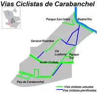 El primer tramo del anillo verde ciclista se realizó en el año 2002 y fue en el tramo que discurre por Carabanchel. El anillo ciclista recorre Carabanchel por la avenida de los Poblados y pasa por el parque de las Cruces y por el parque Sur, dos de los parques más grandes e importantes del distrito.