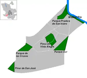 3.- Tercero, la ancha franja sobre la ribera izquierda donde se sitúa el conjunto del Parque de la Arganzuela que incluye el centro de creación de arte contemporáneo de Matadero, y que representa la mayor superficie de espacio verde unitario de la propuesta.