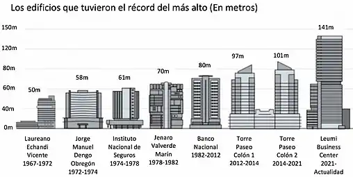 En 2014 se inauguran la Torre Paseo Colón (Torre 2), el primer rascacielos de más de 100 metros de altura de Costa Rica,[2][3] En 2021 se inauguró Leumi Business Center de 38 pisos y 141 metros de altura coronándose como el edificio más alto de Costa Rica y Centroamérica (sin contar a Panamá).[4]