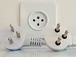 2 pines planos en forma de V invertida y pin central en la parte inferior para la toma tierra. Hay también una versión de clavija con solo dos pines sin la toma tierra. | 10 A / 15 A | ![]() |