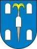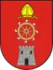En campo de gules, una mitra de oro, una rueda de molino en el centro con ocho puntas y una torre de plata. | |