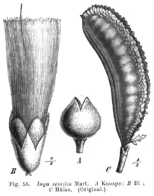 Inga sessilis. A. bud, B. single flower, C. pod.