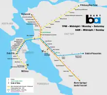 - La línea Richmond - Millbrae opera solamente en días de semana antes de las 7:00 pm a Colma, San Bruno, San Bruno, y las estaciones del sur de San Francisco.[6]