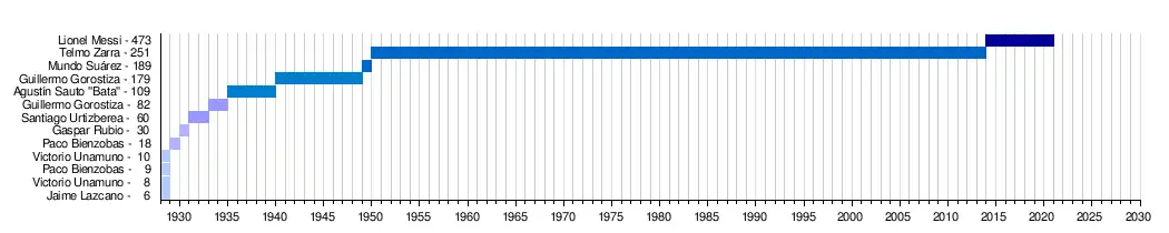 Entre los jugadores en activo, son el ya citado Joaquín Sánchez, el argentino Lionel Messi , el navarro Raúl García, y el sevillano Sergio Ramos, quienes suman más encuentros con 585, 520, 525 y 508 respectivamente repartidos en veinte, diecisiete, diecisiete y dieciocho temporadas cada uno.
