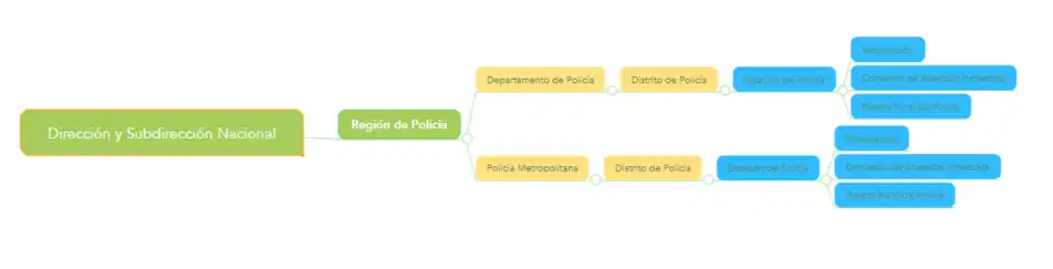 Dentro de esta organización está contemplado que cada dirección operativa, tenga una dependencia que represente a cada oficina asesora y cada dirección administrativa (excepto DINCO, DISAN y DIBIE, las cuales son coordinadas directamente desde sus respectivas direcciones). Igualmente cada comando de departamento o de metropolitana, además de las anteriores dependencias, deben tener bajo su mando una Seccional de Investigación Criminal (SIJIN), dependiente de la Dirección de Investigación Criminal (DIJIN), y una Seccional de Inteligencia Policial (SIPOL), dependiente de la Dirección de Inteligencia Policial (DIPOL).