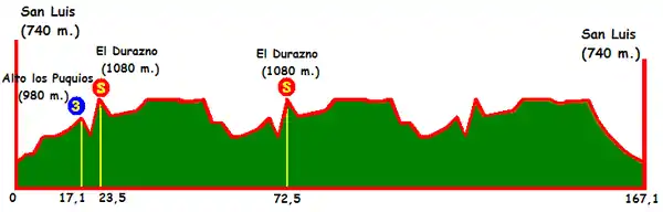 La etapa comenzó con un circuito céntrico de 4 vueltas en la Ciudad de San Luis para luego tomar la R7 rumbo a Justo Daract.