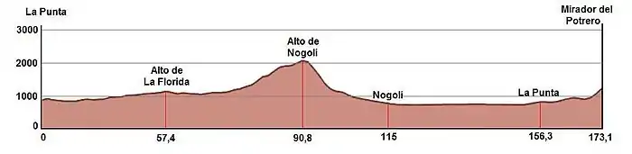 La 3.ª y la 6.ª etapa culminaron en alto, (en el Mirador del Potrero y en el Mirador del Sol) y la 4ª fue la contrarreloj individual sobre 19,2 km.