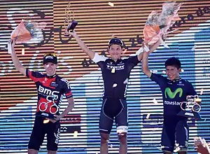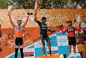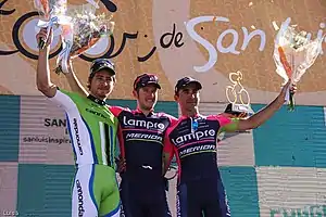 Etapa 4Potrero de los Funes-Cerro El Amago 168,7 kmLa 4ª etapa fue con un final inédito en el Cerro El Amago de 1ª categoría. Comenzó en el Circuito de Potrero de los Funes y tras un recorrido plano, al pasar por San Francisco del Monte de Oro la carretera picaba hacia arriba para pasar por el Alto del Embalse (3ª categoría). Luego comenzó el ascenso final en una carretera de cemento que culminó a 1.720 de altitud. La subida de 10,5 km de longitud y 7,2 % de promedio, tenía rampas de hasta 11,5 % y el último kilómetro de 10,7 %. La etapa en sí, no finalizó en alto, ya que luego de coronado el Cerro El Amago faltaban 1,8 kilómetros para la meta. ![]() Podio de la 4° etapa, de izquierda a derecha: Sergio Godoy (SLS), Nairo Quintana (MOV) y Darwin Atapuma (BMC). En la primera parte de la etapa se formó la escapada del día integrada por Juan Ignacio Curuchet (Argentina), Juan Esteban Arango (Colombia), Jonny Clarke (UnitedHealthcare), Julián Gaday (Buenos Aires Provincia) y Matías Presa (Uruguay) pero su esfuerzo sucumbió a 20 km para la llegada. Comenzado el ascenso al Cerro El Amago, el primero en salir fue el argentino del San Luis, Sergio Godoy. Nairo Quintana respondió al ataque y ambos comenzaron a alejarse del grupo. El ritmo que impuso Quintana terminó por descolgar a Godoy quedando el colombiano solo en la delantera. Mientras por detrás se formó un pequeño grupo con Atapuma, Moyano, Rubiano y Lucas Euser, el líder de la general Phillip Gaimon iba quedando retrasado. Quintana coronó el cerro y con los puntos que obtuvo alcanzó el liderato por el maillot de la montaña, hasta ese momento en manos de Julián Arredondo. Llegó a la meta en forma solitaria ganando la etapa y aventajando en 50 segundos a Sergio Godoy y un minuto y medio a Atapuma. Gaimon, que en la general le llevaba a Quintana 4 min 19 s, llegó a 4 min 15 s del colombiano con lo cual retuvo el maillot de líder por apenas 4 segundos.[5]