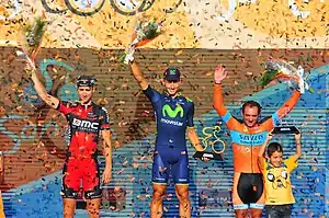 Etapa 5San Luis-San Luis 19,2 kmUna crono plana y corta en la ciudad de San Luis, era el escenario para que se lucieran los especialistas, entre los que se destacaba Taylor Phinney del BMC. También sería una jornada clave en la lucha por el maillot naranja, ya que Phillip Gaimon contaba con solo 4 segundos de ventaja sobre Nairo Quintana. La sorpresa la dio el italiano del Movistar Adriano Malori batiendo a Phinney por 3 segundos, mientras el local Jorge Giacinti terminó tercero. En la lucha por la general, Quintana paró los relojes 30 segundos antes que Gaimon y lo desplazó del primer lugar, logrando la 16ª posición en la etapa (a 1 min 18 s de Malori) mientras que el estadounidense fue 33º. Darwin Atapuma que peleaba por un lugar en el podio final también relegó posiciones al finalizar a 2 minutos de Quintana.[6] ![]() Podio de la 5° etapa, de izquierda a derecha: Taylor Phinney (BMC), Adriano Malori (MOV) y Jorge Giacinti (SLS).