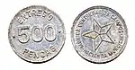 $ 0.50 | ? | 35 mm (diámetro). | Níquel. | Inscripciones "-.-", "EXPLOTADORA" y "-.-"; leyendas "SOCIEDAD" y "DE PALO DE TINTE". | Inscripción "50".[11] | Punteada. | ? | ? | ? | Carmen. | Carmen. | |