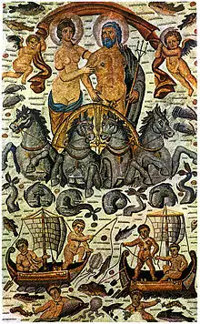 Dios del mar, los ríos, inundaciones, sequías y terremotos. Es uno de los hijos de Cronos y Rea y hermano de Zeus y Hades. Gobierna uno de los tres reinos del universo como rey del mar y de las aguas. En el arte clásico, se le representa como un hombre maduro de complexión robusta con una barba a menudo exuberante, y portando un tridente. El caballo y el delfín son sus animales sagrados. Estaba casado con Anfítrite y algunas historias especifican un romance con Medusa qué la llevó a dar a luz a Pegaso, de su cuello, cuando Perseo cortó su cabeza. Sus símbolos son el tridente, el caballo, los delfines, peces y el toro. Su equivalente romano era Neptuno. |