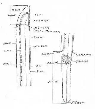 • nakago (茎, espiga) - parte sin pulir de una cuchilla que está oculta por la empuñadura. (ver imagen)[18][41]