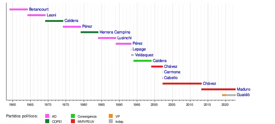 La siguiente es una lista, en orden cronológico, de las personas que han ejercido la jefatura de estado o de gobierno a través de la historia y de diversas formas, incluyendo la época de la Corona Española. Venezuela ha contado con 50 venezolanos que han ocupado la presidencia de manera oficial, constitucional o reconocida; en 60 administraciones desde la independencia de España en 1811, hasta hoy.[1][2][3][4][5][6][7][8]