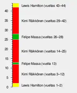 • Lewis Hamilton fue penalizado con 25 segundos por saltarse una chicana cuando se disputaba la primera posición con Kimi Räikkönen en los últimos compases de carrera.[7]