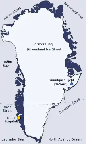 La tabla se ha ordenado geográficamente, partiendo del cabo Morris Jesup, el extremo septentrional de la gran isla de Groenlandia y siguiendo su litoral en el sentido de las agujas del horario: