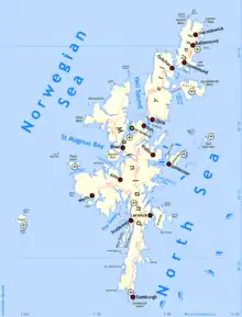 - Isla de St Ninian : Coar Holm, Fora Stack, High Herbi Clett, Hevda, Hich Holm, Inns Holm, Loose Head, Sand Skerry, Sweyn Holm.