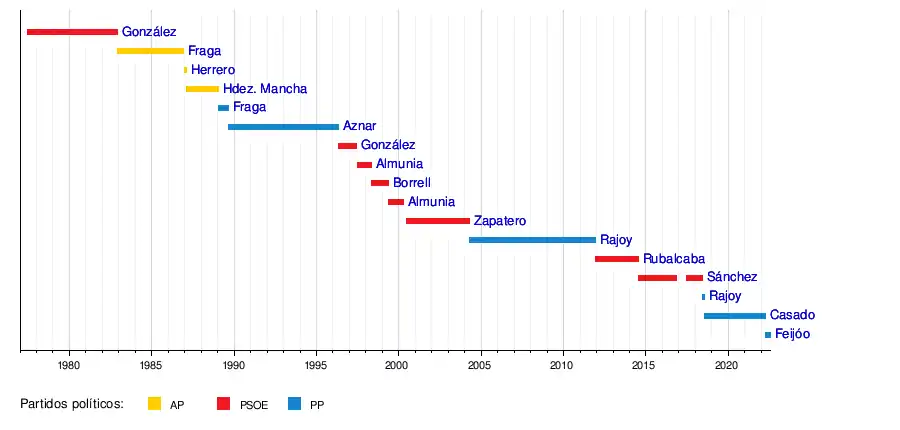 José María Aznar | 21 de noviembre de 1989-4 de mayo de 1996 | PP | IV Legislatura V Legislatura | |