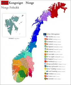 - provincia (fylke): las provincias se agrupan por regiones según el color del sombreado del mapa del margen derecho;