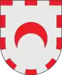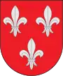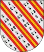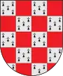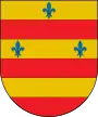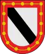 De plata, tres fajas de gules, mantelado de azul, dos leones afrontados de plata, brochante sobre la partición un cabrio combado de gules cargado de una cadena de oro; el todo bajo un jefe de gules con medio carbunclo cerrado pomelado naciente, de oro. |