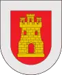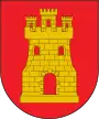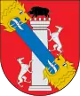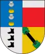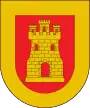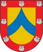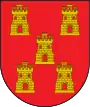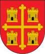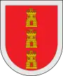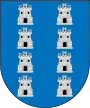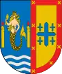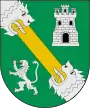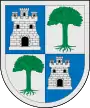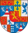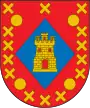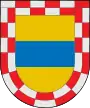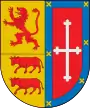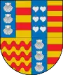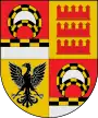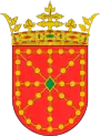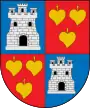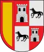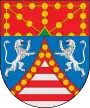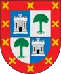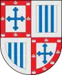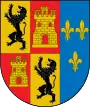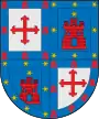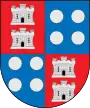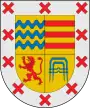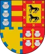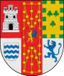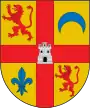 Terciado en pal: 1 de gules, castillo de plata, cortado (color desconocido), un escudete de plata cargado de tres fajas vibradas de azul; 2 de Navarra, cargado de un escudete de gules con grifo de oro armado y alado de azul; 3 de oro, con tres hojas o tréboles y bordura componada (color desconocido); cortado de plata, león de azul. |