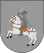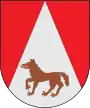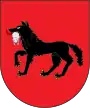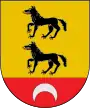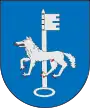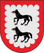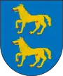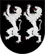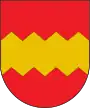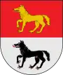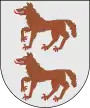 De oro, dos lobos de sable, bordura angrelada de gules. |