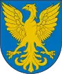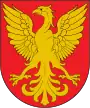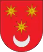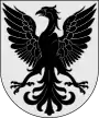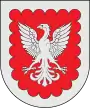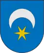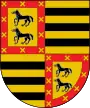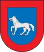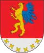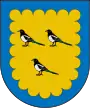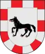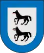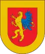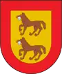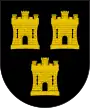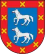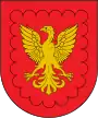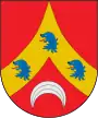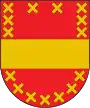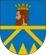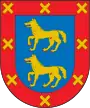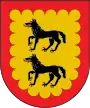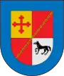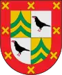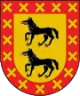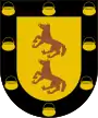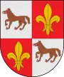 De oro, dos lobos de sable; bordura de gules con dieciséis aspas de oro. |