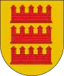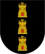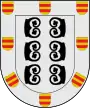 De oro, tres palos de sable; bordura de gules con catorce aspas de oro. |