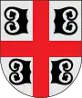 De plata, cruz llana de gules, cantonada de cuatro eslabones de sable adosados. |