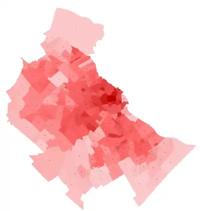 Mapa de la tercera división territorial del Conurbano Bonaerense y su densidad según cada localidad y/o barrio. La numeración de cada localidad o barrio está indicada en la tabla.