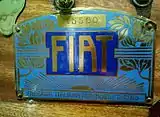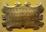 ![]() | 1899 | 1901 | Rectangular | No | Fiat 3 ½ HP | En 1899 Fiat anuncia su nacimiento en un manifiesto publicitario del pintor turinés Giovanni Carpanetto. Una reproducción del mismo en una placa se convierte en su primer logotipo. Se puede leer la razón social de la empresa (Fabbrica Italiana Automobili Torino), y su acrónimo F.I.A.T., así como el número de serie del modelo. La escritura se realizaba a mano. Los primeros automóviles en mostrarla son los Fiat 3 ½ HP producidos entre 1899 y 1900. | |