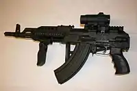AK-74M | ![]() | Fusil de asalto con cargador de 30 cartuchos. Esta arma es usada principalmente por las fuerzas aerotransportadas sirias.[4] | 5,45 x 39 M74 | 5,45 mm | ![]() |