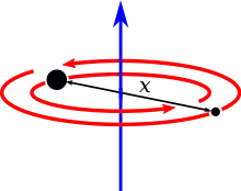 Dos masas puntuales, m1 y m2, con masa reducida μ y separadas a una distancia x, alrededor de un eje que pasa a través del centro de masa del sistema y perpendicular a la línea que une las dos partículas. | ![]() |
