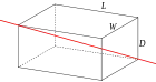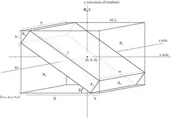 Ortoedro macizo inclinado de profundidad d, ancho w, y longitud l, y masa m, rotando alrededor del eje vertical (eje y en figura). | ![]() |