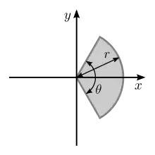 Un sector circular macizo de ángulo θ en radianes y radio r con respecto a un eje que pase por el centroide del sector circular y el centro del círculo original | ![]() | Esta fórmula es válida sólo para 0 ≤ ≤ . | ||
